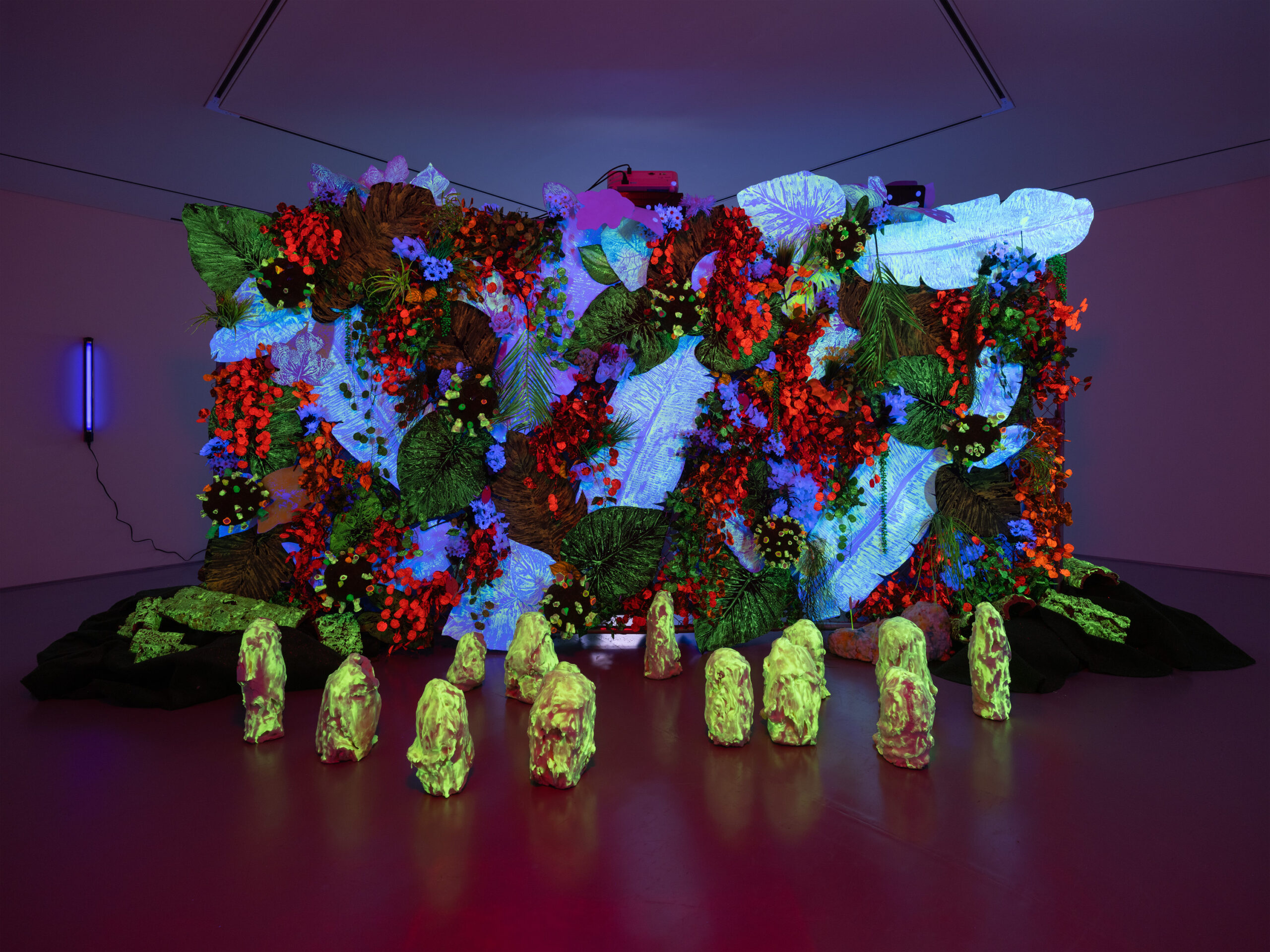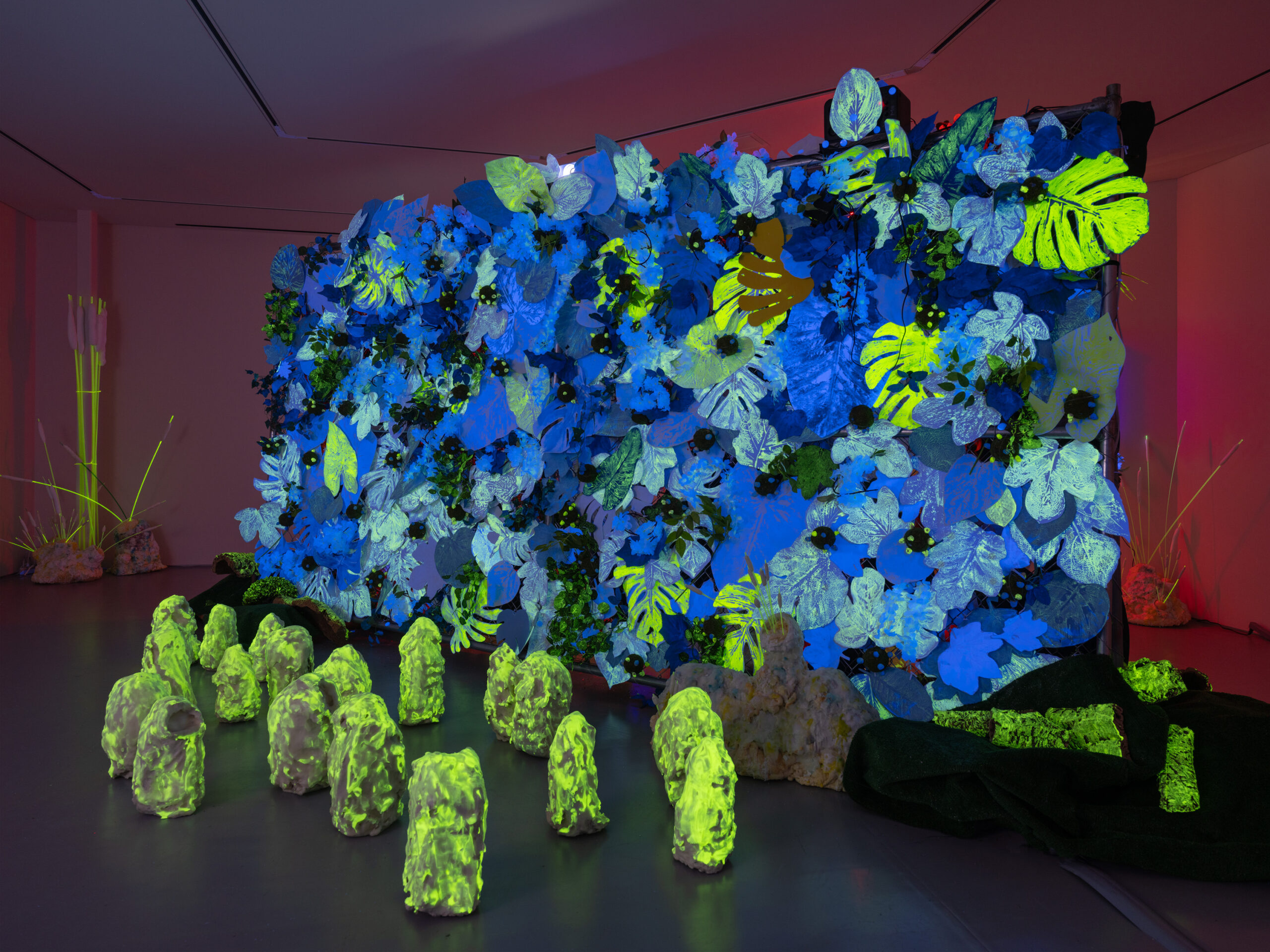 In her multimedia installation, Cecile Chong explores the intricate relationship between people and the ecologies to which they belong. The room-dividing fences found throughout Chong’s _other Nature series symbolize systems of extraction and geopolitical border tensions. Flora peek through and around the fence, exemplifying nature’s resistance to manmade divisions, and infant-like sculptural figures, which the artist calls guaguas, illuminate the space, guiding viewers along various pathways.
