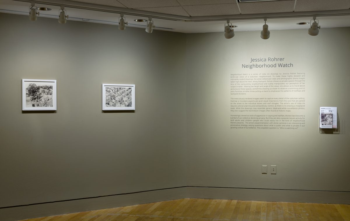 Neighborhood Watch is a series of India ink drawings by Jessica Rohrer featuring bird’s-eye views of a suburban neighborhood. To make these highly detailed and intimately scaled drawings, the artist referenced video and photographic drone images taken high above her New Jersey backyard. Rohrer shows us private spaces through the lens of the surrounding neighborhood and subtly manipulates our perception of her subject matter. Altering the height and angle of the views, she allows us to travel above and around these spaces, sometimes drawing us closer to observe a swimming pool or patio furniture, at other times pulling us back to emphasize the patterns of rooftops and backyard divisions.