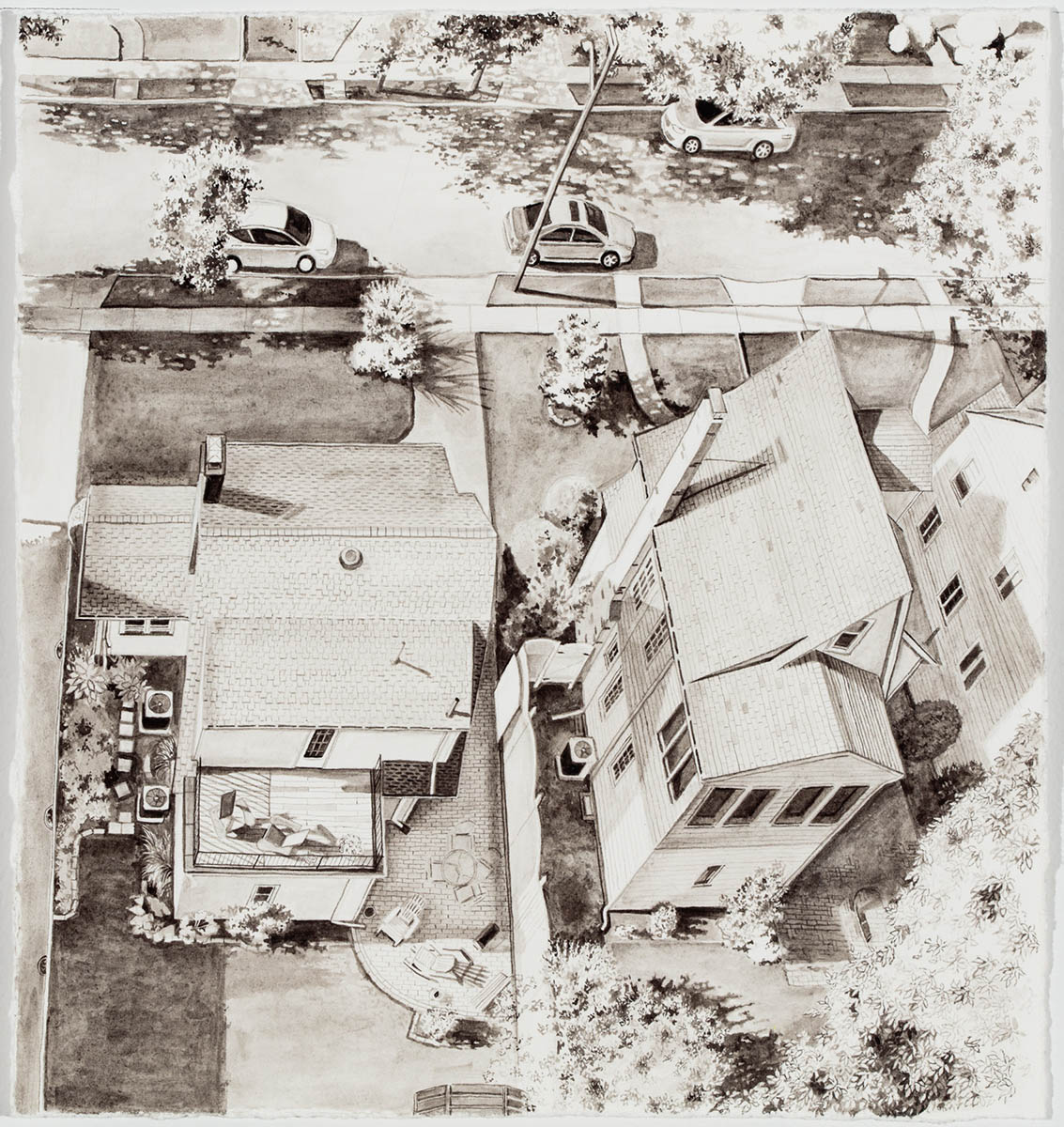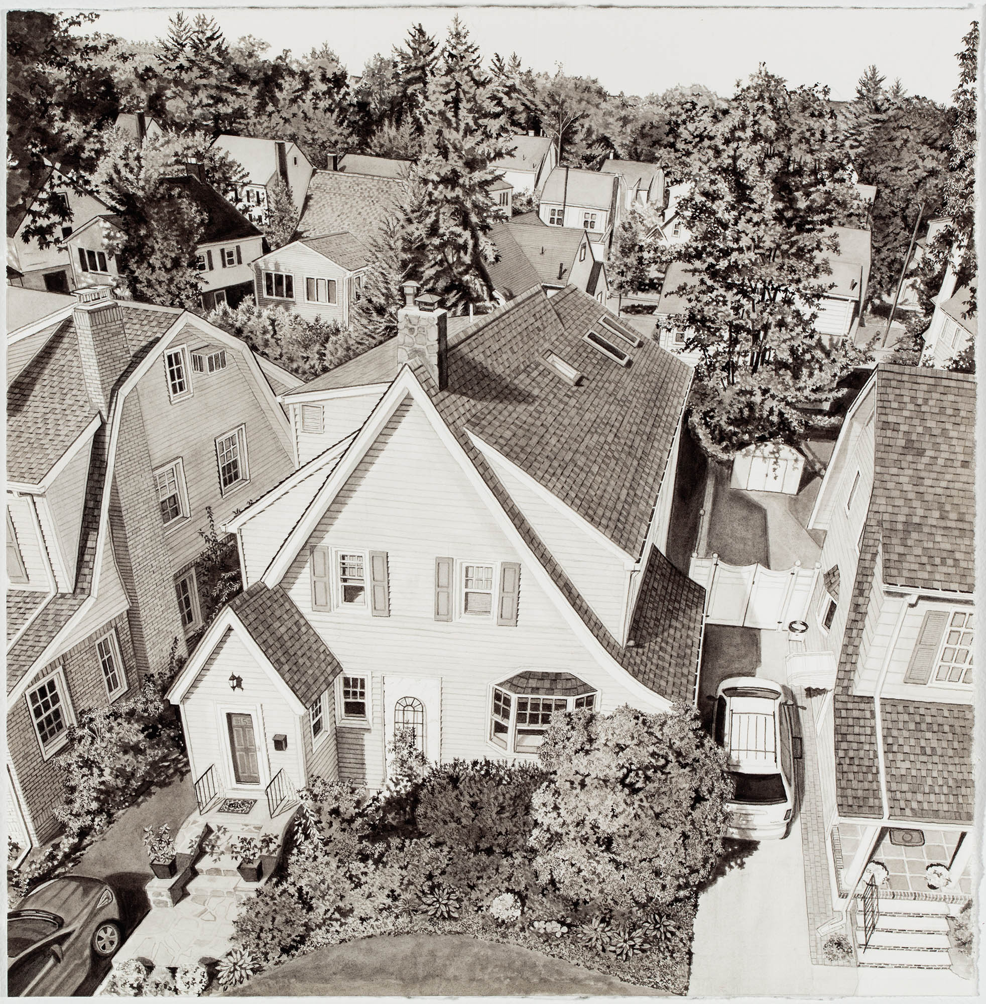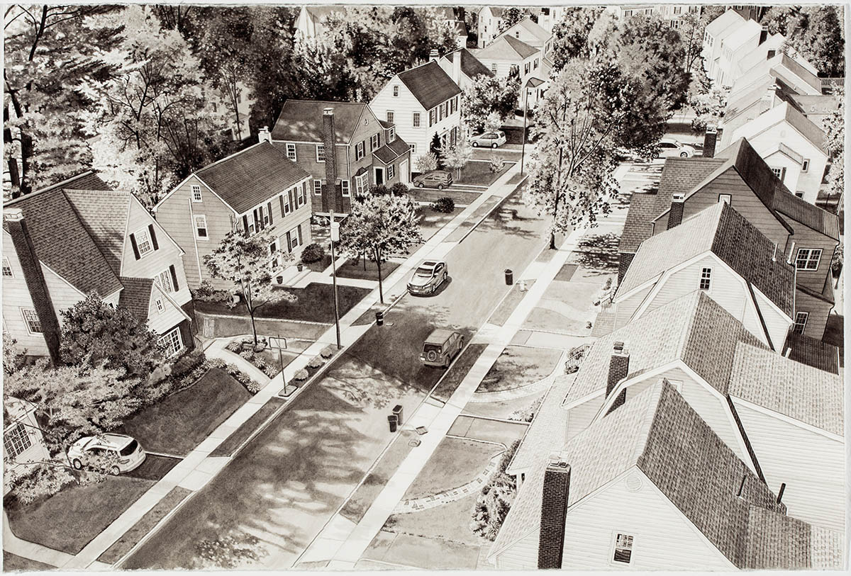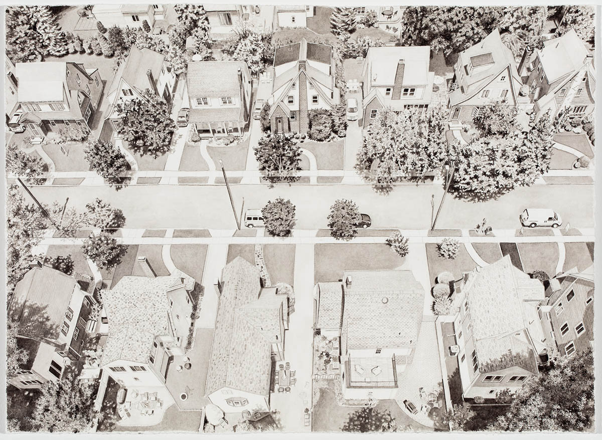 The meticulously rendered images seem to capture every detail of the suburban setting. Familiar or mundane aspects are given equal importance, from the cars that are parked on the street to the individual leaves and roof shingles. The artist’s use of India ink requires precise planning and extraordinary control, as there is no erasing a misplaced mark. While the drawings may resemble generic black-and-white surveillance photos, they also suggest the hand-drawn images often found on historic maps.