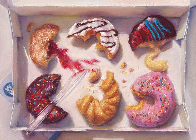 This series, “America’s Food Fetishes,” is artist Judith Leeds’ commentary on both America’s and her addiction to certain foods, those we all hate to love. Eating these comfort foods, though not great for our diet, brings back memories of our childhood. As we continue to eat them throughout our lives, we make new memories. From that first morning cup of coffee to a cheesy pizza, she endeavors to add a bit of humor to illustrate our relationship to these treats.
