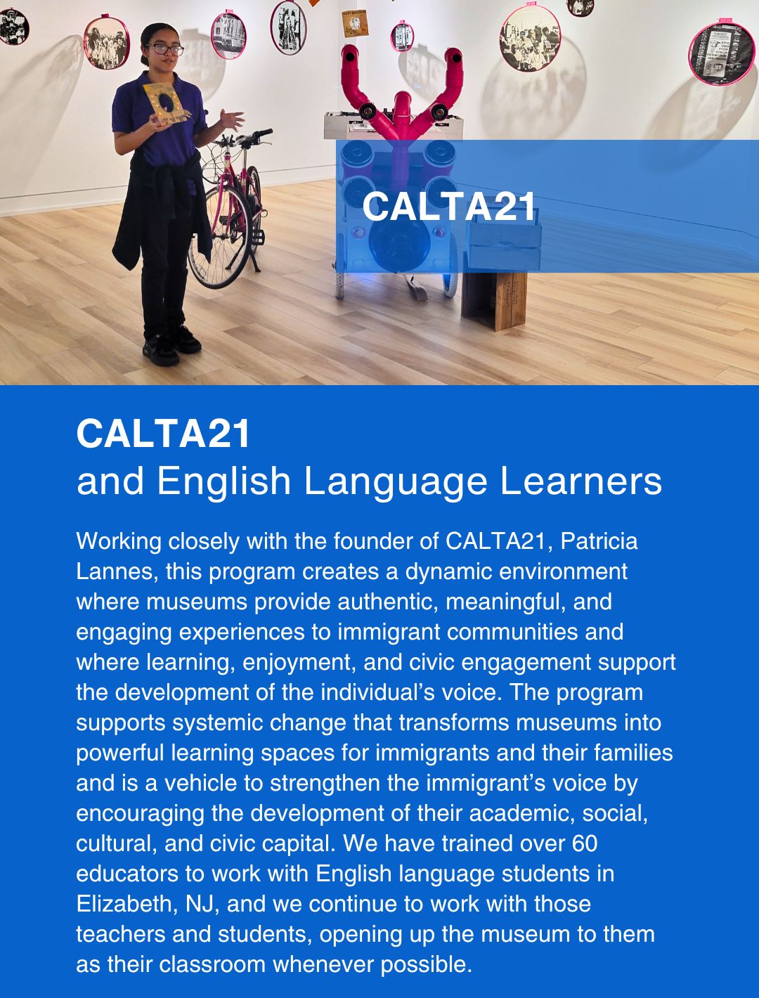 Working closely with the founder of CALTA21, Patricia Lannes, this program creates a dynamic environment where museums provide authentic, meaningful, and engaging experiences to immigrant communities and where learning, enjoyment, and civic engagement support the development of the individual’s voice. The program supports systemic change that transforms museums into powerful learning spaces for immigrants and their families and is a vehicle to strengthen the immigrant’s voice by encouraging the development of their academic, social, cultural, and civic capital. We have trained over 60 educators to work with English language students in Elizabeth, NJ, and we continue to work with those teachers and students, opening up the museum to them as their classroom whenever possible.