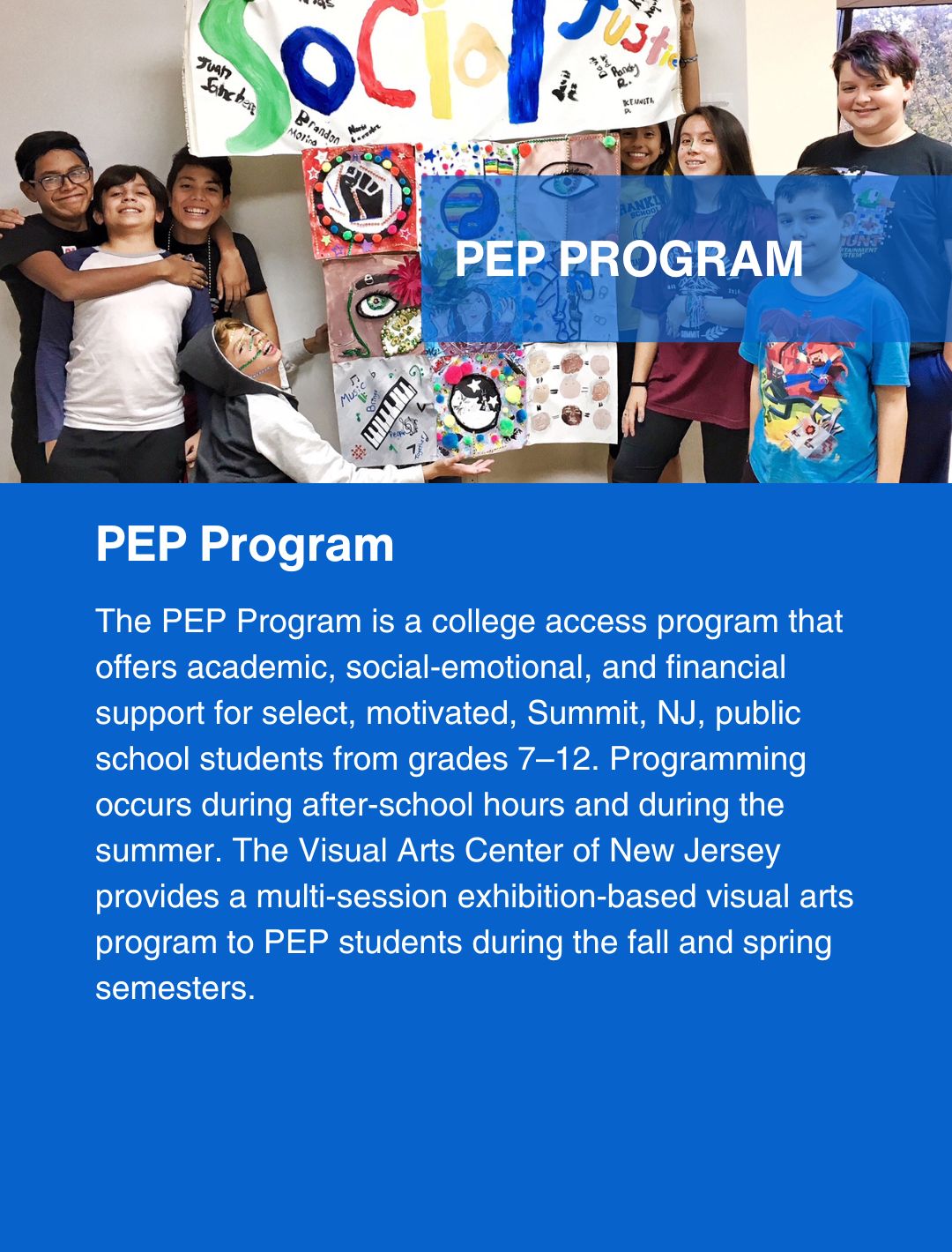 The PEP Program is a college access program that offers academic, social-emotional, and financial support for select, motivated, Summit, NJ, public school students from grades 7–12. Programming occurs during after-school hours and during the summer. The Visual Arts Center of New Jersey provides a multi-session exhibition-based visual arts program to PEP students during the fall and spring semesters.