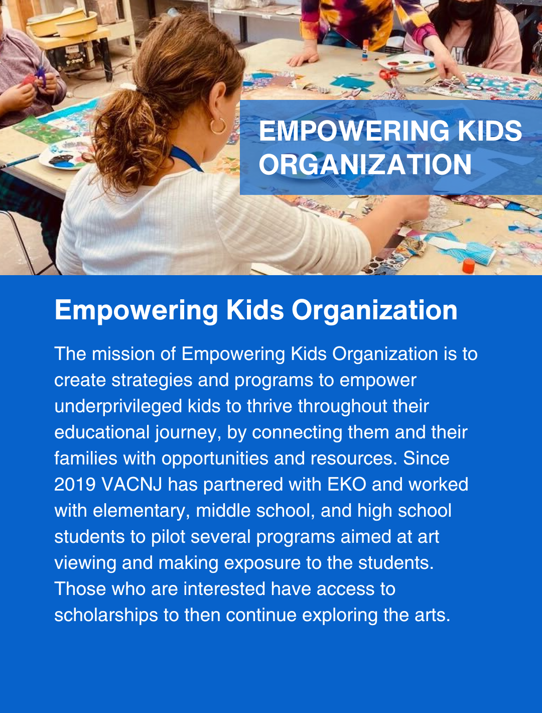 The mission of Empowering Kids Organization is to create strategies and programs to empower underprivileged kids to thrive throughout their educational journey, by connecting them and their families with opportunities and resources. Since 2019 VACNJ has partnered with EKO and worked with elementary, middle school, and high school students to pilot several programs aimed at art viewing and making exposure to the students. Those who are interested have access to scholarships to then continue exploring the arts.